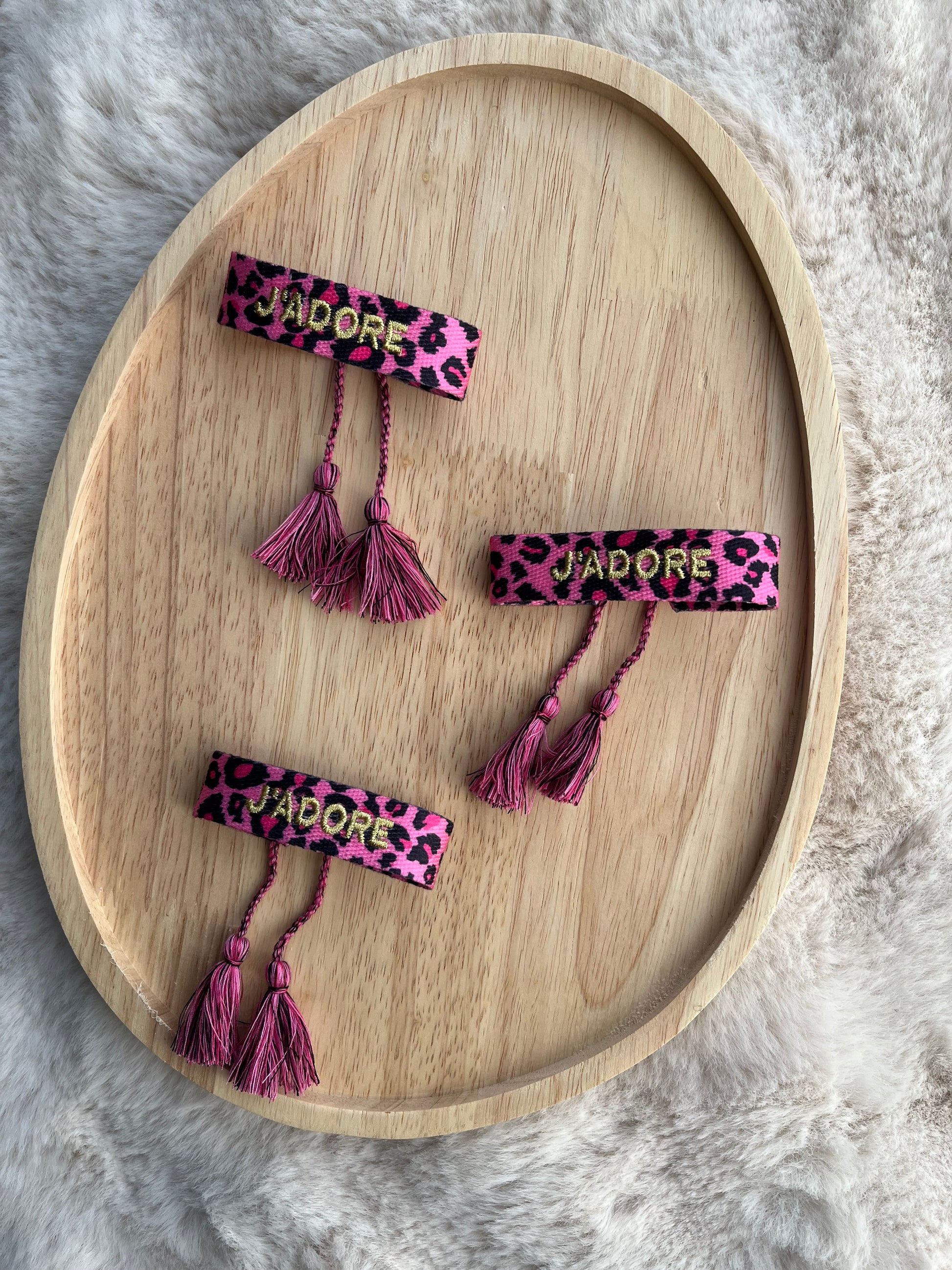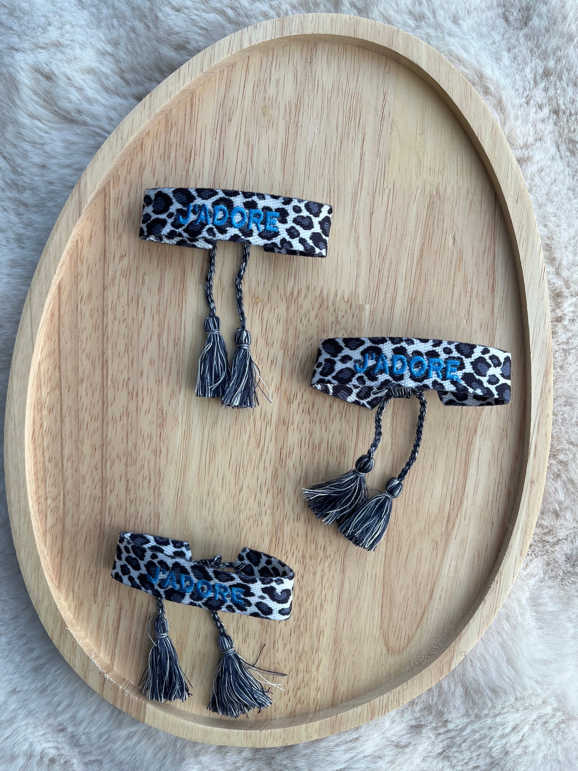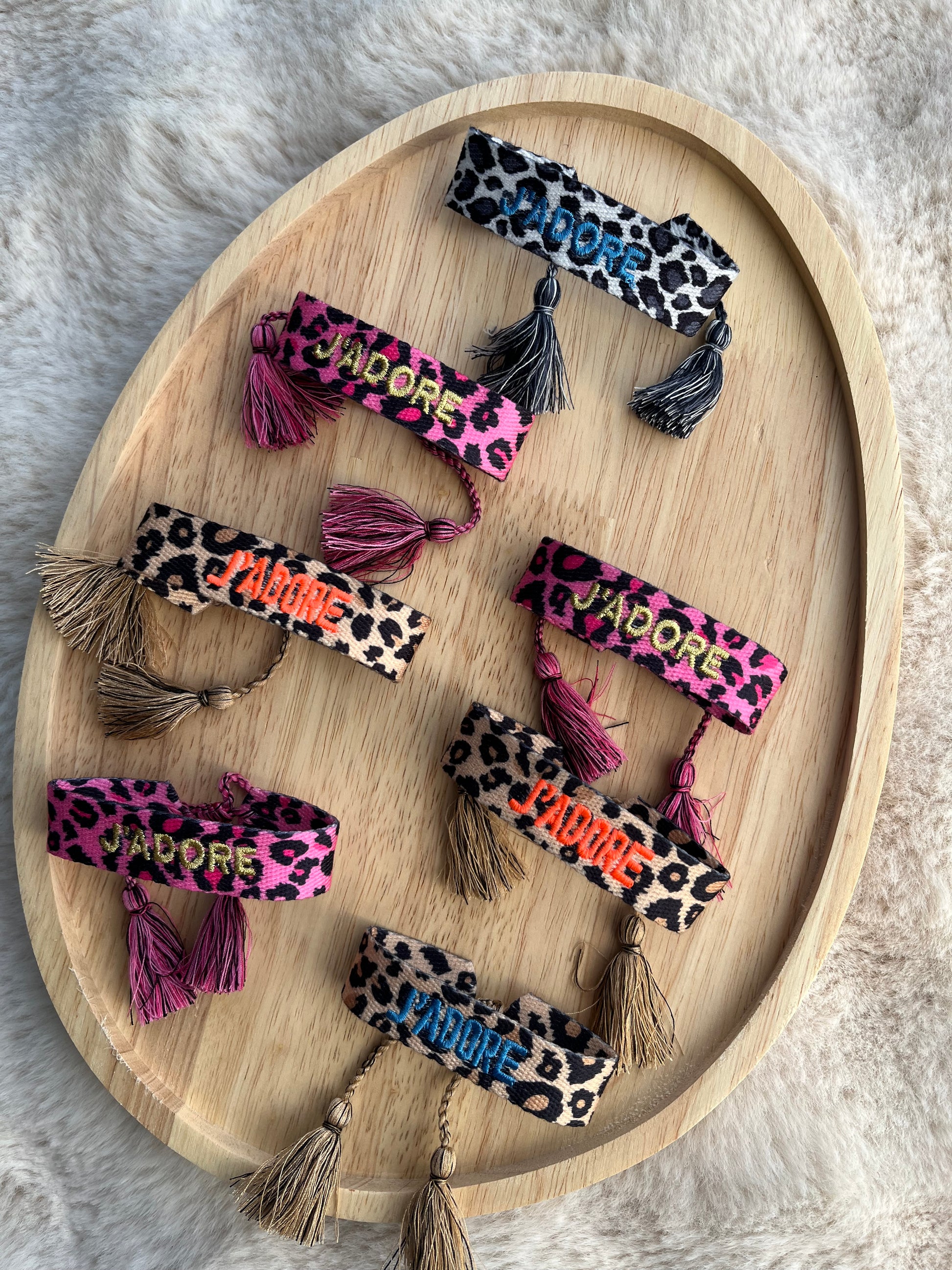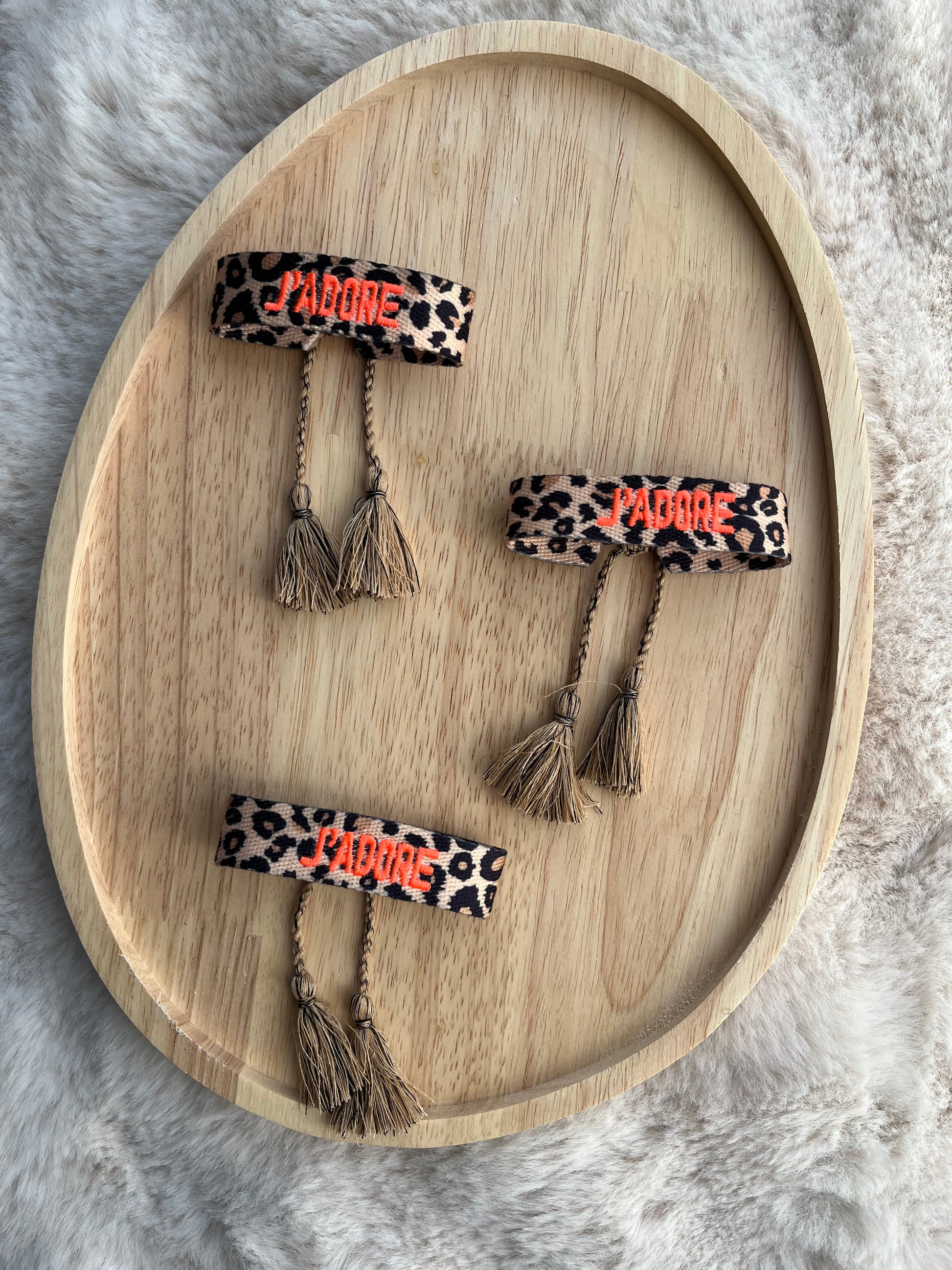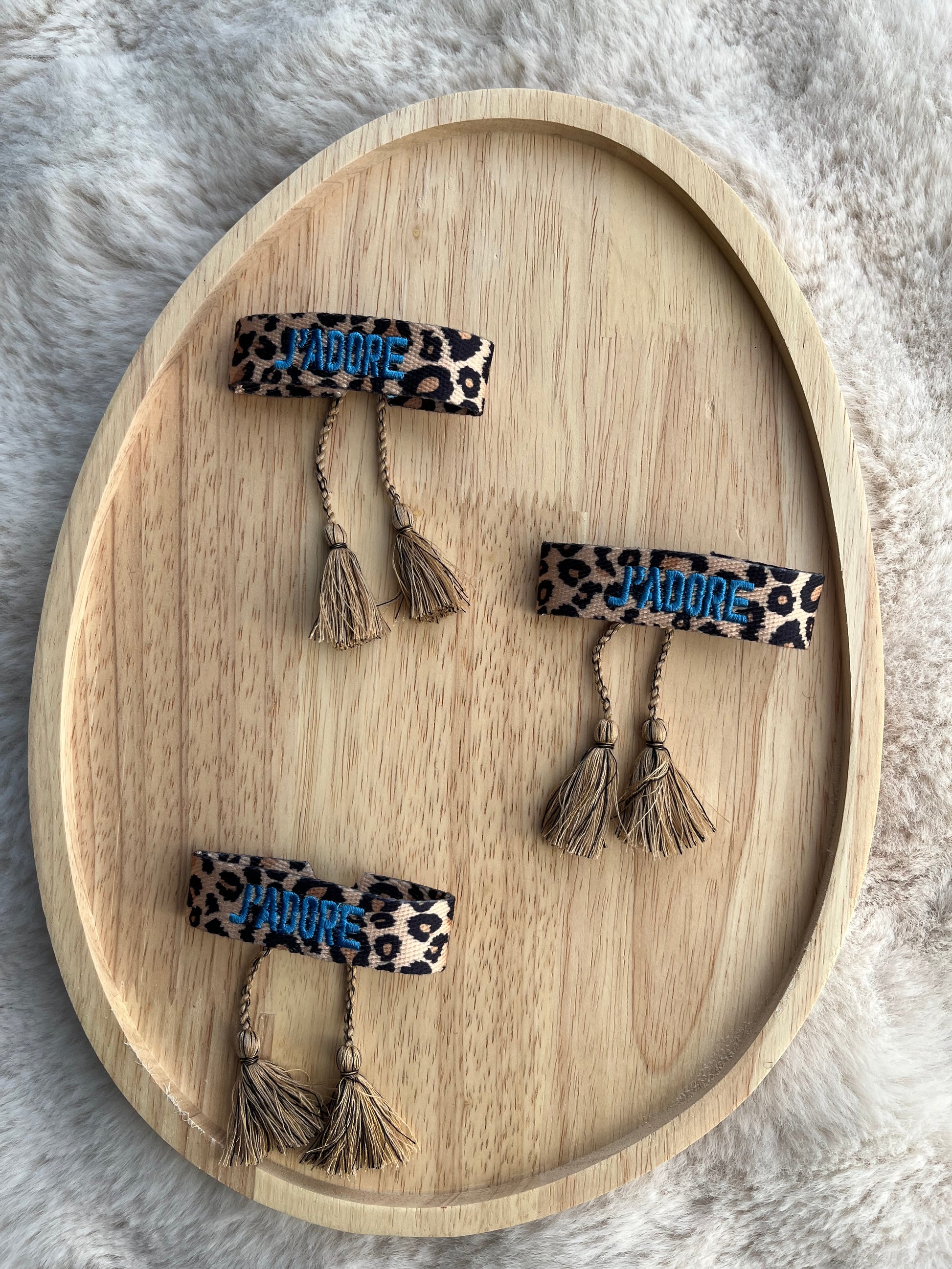 Bracelet tresse j’adore léopard rose/ orange fluo/ bleu électrique/ bleu clair